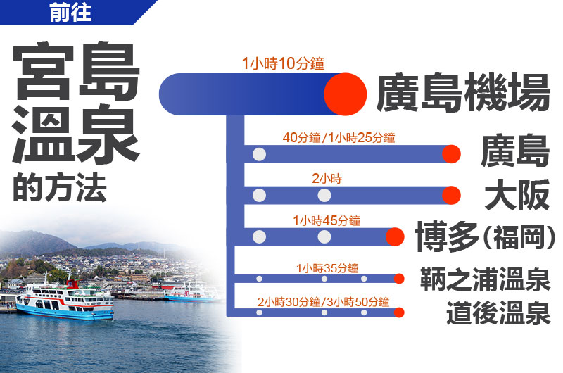 要從鞆之浦溫泉前往宮島溫泉時,可以搭乘JR新幹線與在來線,要從道後溫泉時,可以搭乘高速客輪。