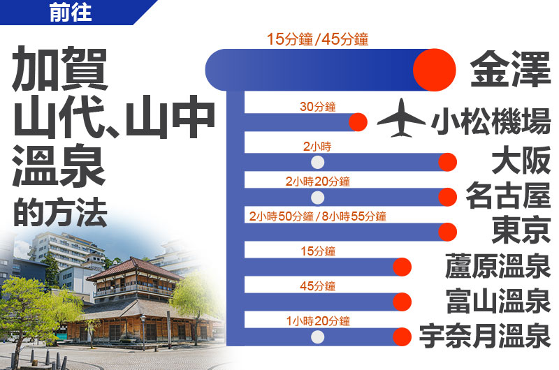 要從小松機場前往加賀山代、山中地區時,可以搭乘機場巴士,要從金澤時,可以搭乘鐵路,要從東京時,可以搭乘JR新幹線,要從大阪、京都與名古屋時,可以搭乘JR特急列車與JR新幹線。要從蘆原溫泉前往加賀山代、山中溫泉時,可以搭乘鐵路,要從富山溫泉時,可以搭乘JR新幹線,要從宇奈月溫泉時,可以搭乘鐵路與JR新幹線。